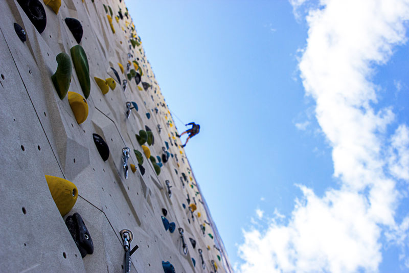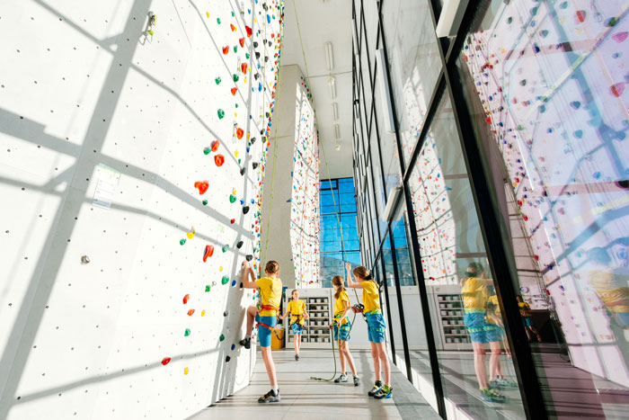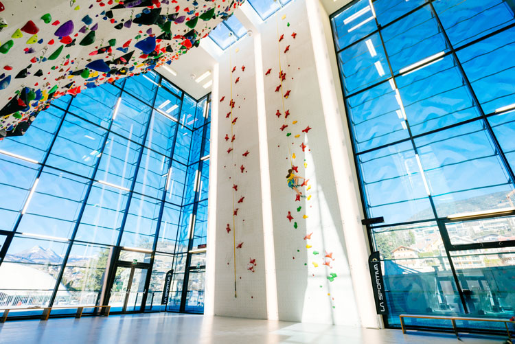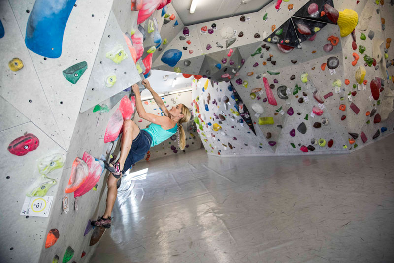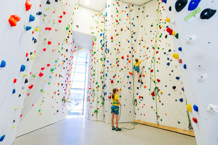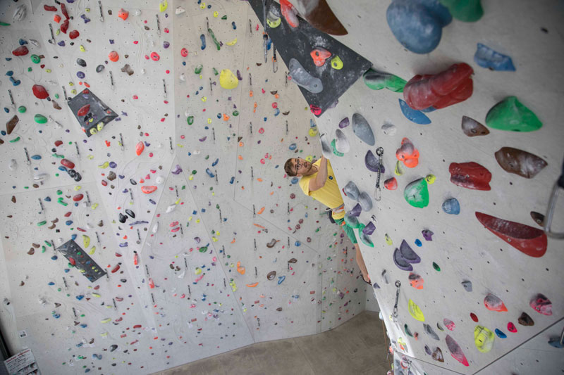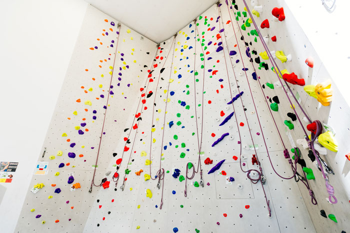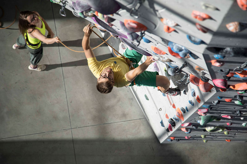 Klettern ist nicht nur Sport, Klettern ist Gemeinschaft, Beisammensein, Spaß und Genuss – und letzteres gleich in vielerlei Hinsicht. In der Bar der Vertikale, die direkt neben dem Eingangsbereich des Kletterzentrums angesiedelt ist, gibt es nämlich Getränke, Snacks – und einen wundervollen Ausblick in den Leadbereich der Vertikale. Gemütlich und unkompliziert – so wie Kletterer eben auch sind –, ist auch die Bar der Vertikale konzipiert. Sie lädt zum Verweilen ein, zum Zusammensitzen, zu tiefsinnigen Klettergesprächen und zum Seilschaften knüpfen – bei einem Bier, Saft oder starkem Kaffee, damit man dann wieder gestärkt an die Wand gehen kann.